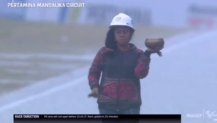 TIMES Bangkalan/Raden Rara Isti Wulandari, sang pawang hujan saat Sirkuit Mandalika, Lombok Tengah, NTB, Minggu (20/3/2022) (FOTO: t-2.tstatic.net)
